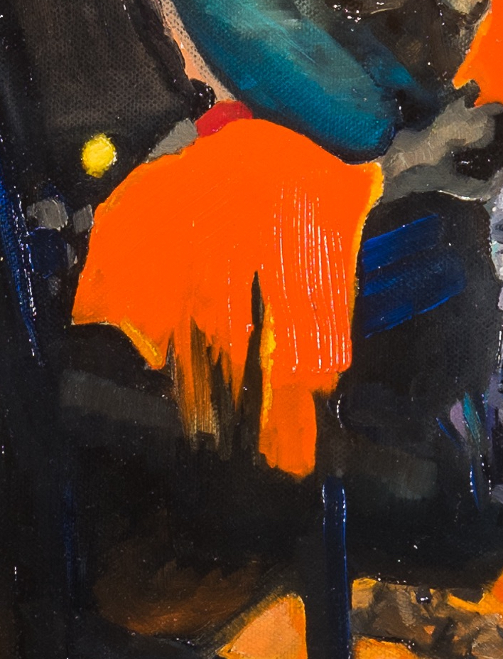 #22. Well F**k-a-doodle-do!……This painting took a long time to finish!….It’s amazing how much effort it takes to make a painting look like it took no effort at all!…..I started this painting of my cousins girl, Ughaan, in the second week of February…All was going well – And on day five I was already thinking I might be finished in a couple more days – I was happy about this because usually I finish a painting this size in nine days and that would mean I was getting quicker….I had completed the arms and the shirt and was working simultaneously on the denim jacket and face….But then out of no-where….I was standing in front of my easel, when suddenly and without warning, I collapsed on the floor! – Literally!!… I was completely and utterly f****d!!! ……That’s never happened to me before!!….I’ve worked physically hard, all my life and never been beat!….. But this was different… You see, since mid December 2021, until mid February 2022, I had painted for a total of 36 days and I was mentally drained. My brain just gave up! ……I couldn’t even manage to clean my brushes that day. It took me two months to recharge properly before I could even look in the direction of my easel again….I had to scrub out the work I already did on the jacket and face and start over. But, as it turns out – Being that f****d helped me get to the next level! – ‘Cos when I finally picked up my brushes again, – I still didn’t have enough energy to maintain the same concentration and focus I usually have……And this forced me to give less of a f**k!- Not that I wasn’t caring about my work!- I always strive for perfection when I paint….But this time I simply couldn’t!….So, I decided to just experiment and go with the flow….let it evolve by itself uninhibited…… As a result, my work became more expressive!……You can’t just hang out by the clit all day long!- Sometimes you just gotta take a deep breath, put your head down – Make that pointy shape with your tongue…Then stick it in as far as it can go!…And just see what happens!